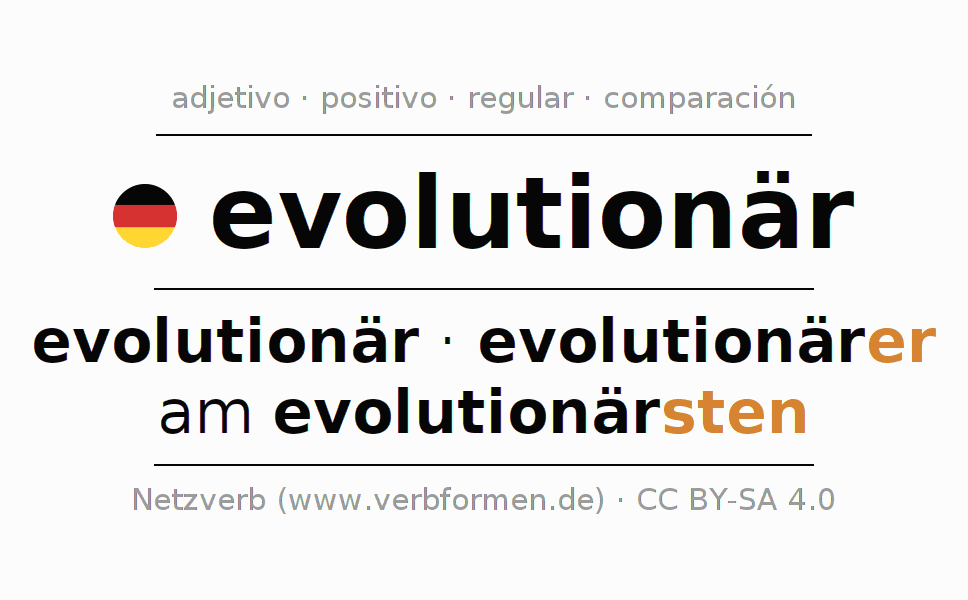 El adjetivo evolutionär se declina (evolucionario, evolutivo) utilizando las construcciones de comparación. Las terminaciones necesarias para la exaltación, comparación y el superlativo son er/sten. El adjetivo evolutionär puede ser utilizado de forma atributiva en frente de un sustantivo así como de forma predicativa en conjunto con un verbo.Aquí puedes declinar y comparar no solamente evolutionär sino también todos los adjetivos alemanes. Comentarios ☆