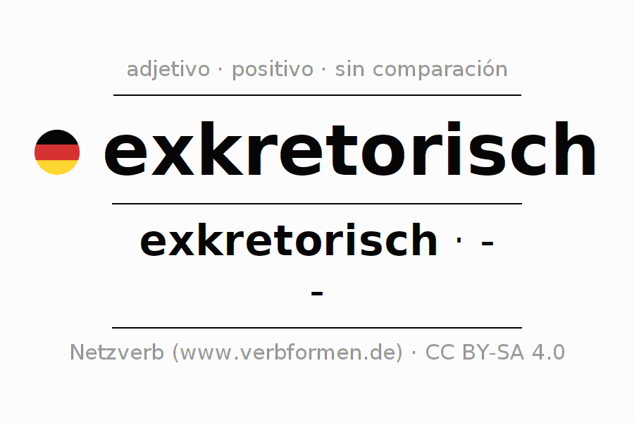 El adjetivo exkretorisch se declina (excretor) utilizando la construcción exkretorisch, la cual no puede ser exaltada, es decir este adjetivo no permite formas del comparativo o superlativo. El adjetivo exkretorisch puede ser utilizado de forma atributiva en frente de un sustantivo así como de forma predicativa en conjunto con un verbo.Aquí puedes declinar y comparar no solamente exkretorisch sino también todos los adjetivos alemanes. Comentarios ☆
