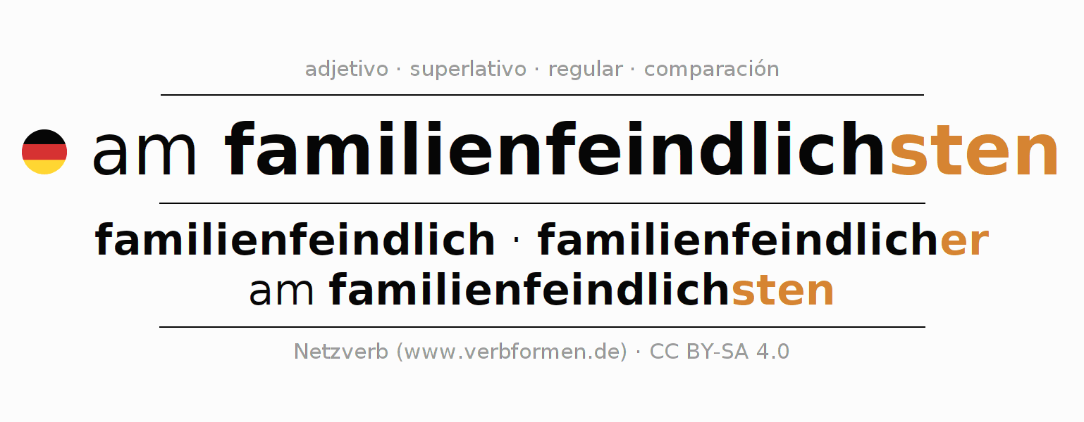 El comparativo en forma de tabla con todas sus formas de declinación: fuerte, débil y mixta. Estas están representadas de forma clara en una tabla sinópica en singular, plural y en los cuatro casos gramaticales: nominativo (primer caso), genitivo (segundo caso), dativo (tercer caso) y acusativo (cuarto caso). Aquí encontraras más información acerca del tema Wiktionary am familienfeindlichsten y aquí también a través del Duden am familienfeindlichsten.