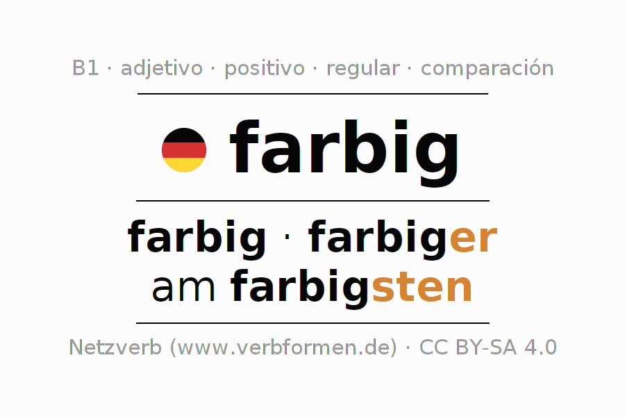 El adjetivo farbig se declina (colorido, multicolor) utilizando las construcciones de comparación. Las terminaciones necesarias para la exaltación, comparación y el superlativo son er/sten. El adjetivo farbig puede ser utilizado de forma atributiva en frente de un sustantivo así como de forma predicativa en conjunto con un verbo.Aquí puedes declinar y comparar no solamente farbig sino también todos los adjetivos alemanes. Comentarios ☆