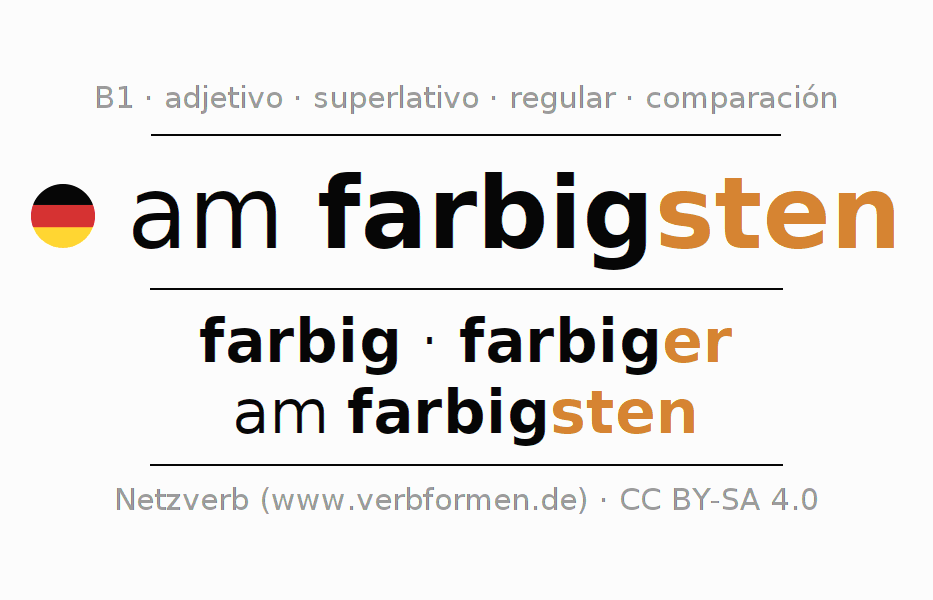 El adjetivo am farbigsten se declina (colorido, multicolor) utilizando las construcciones de comparación. Las terminaciones necesarias para la exaltación, comparación y el superlativo son er/sten. El adjetivo am farbigsten puede ser utilizado de forma atributiva en frente de un sustantivo así como de forma predicativa en conjunto con un verbo.Aquí puedes declinar y comparar no solamente am farbigsten sino también todos los adjetivos alemanes. Comentarios ☆