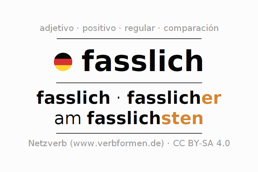 El adjetivo fasslich se declina (comprensible, entendible) utilizando las construcciones de comparación. Las terminaciones necesarias para la exaltación, comparación y el superlativo son er/sten. El adjetivo fasslich puede ser utilizado de forma atributiva en frente de un sustantivo así como de forma predicativa en conjunto con un verbo.Aquí puedes declinar y comparar no solamente fasslich sino también todos los adjetivos alemanes. Comentarios ☆