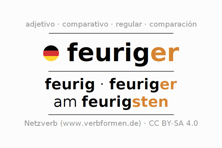 El comparativo en forma de tabla con todas sus formas de declinación: fuerte, débil y mixta. Estas están representadas de forma clara en una tabla sinópica en singular, plural y en los cuatro casos gramaticales: nominativo (primer caso), genitivo (segundo caso), dativo (tercer caso) y acusativo (cuarto caso). Aquí encontraras más información acerca del tema Wiktionary feuriger y aquí también a través del Duden feuriger.
