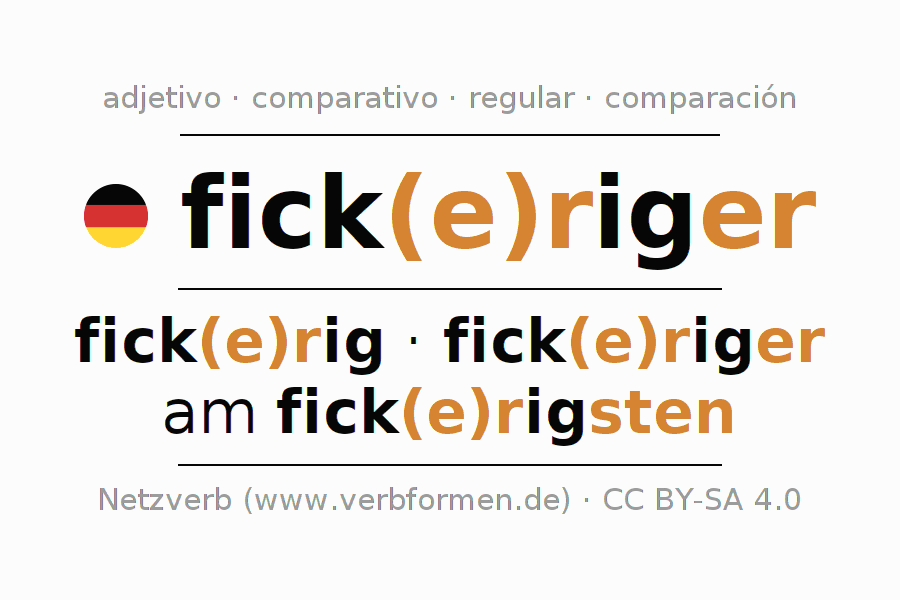 El comparativo en forma de tabla con todas sus formas de declinación: fuerte, débil y mixta. Estas están representadas de forma clara en una tabla sinópica en singular, plural y en los cuatro casos gramaticales: nominativo (primer caso), genitivo (segundo caso), dativo (tercer caso) y acusativo (cuarto caso). Aquí encontraras más información acerca del tema Wiktionary fickeriger y aquí también a través del Duden fickeriger.