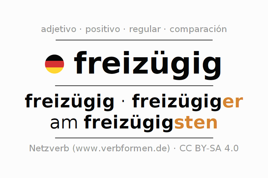 El comparativo en forma de tabla con todas sus formas de declinación: fuerte, débil y mixta. Estas están representadas de forma clara en una tabla sinópica en singular, plural y en los cuatro casos gramaticales: nominativo (primer caso), genitivo (segundo caso), dativo (tercer caso) y acusativo (cuarto caso). Aquí encontraras más información acerca del tema Wiktionary freizügig y aquí también a través del Duden freizügig.