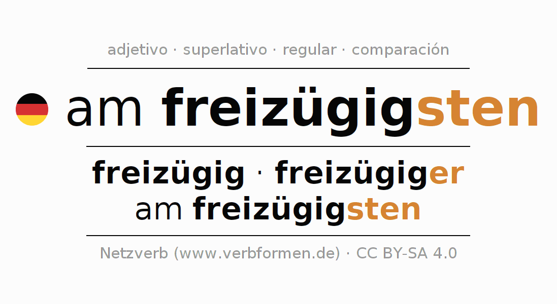 El comparativo en forma de tabla con todas sus formas de declinación: fuerte, débil y mixta. Estas están representadas de forma clara en una tabla sinópica en singular, plural y en los cuatro casos gramaticales: nominativo (primer caso), genitivo (segundo caso), dativo (tercer caso) y acusativo (cuarto caso). Aquí encontraras más información acerca del tema Wiktionary am freizügigsten y aquí también a través del Duden am freizügigsten.