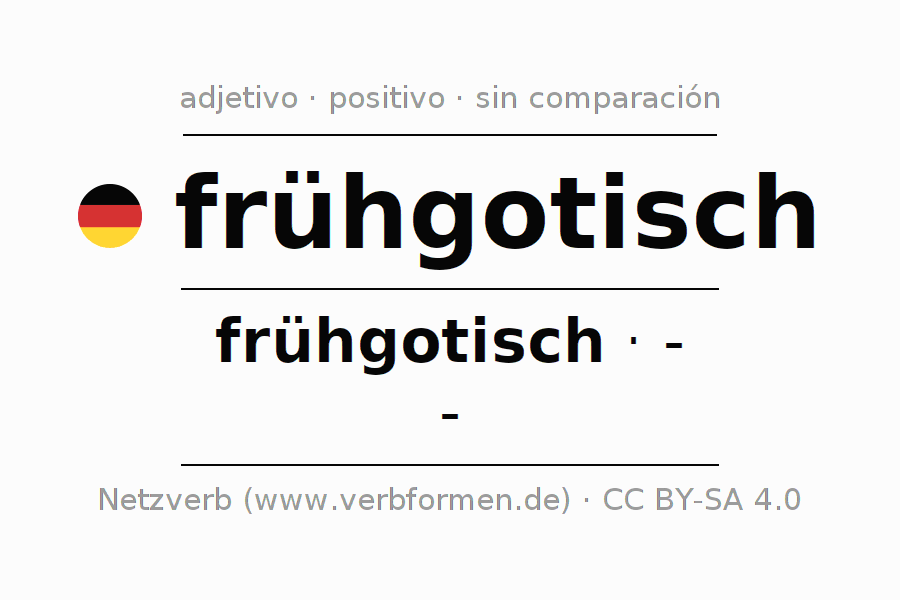 El adjetivo frühgotisch se declina (temprano gótico) utilizando la construcción frühgotisch, la cual no puede ser exaltada, es decir este adjetivo no permite formas del comparativo o superlativo. El adjetivo frühgotisch puede ser utilizado de forma atributiva en frente de un sustantivo así como de forma predicativa en conjunto con un verbo.Aquí puedes declinar y comparar no solamente frühgotisch sino también todos los adjetivos alemanes. Comentarios ☆