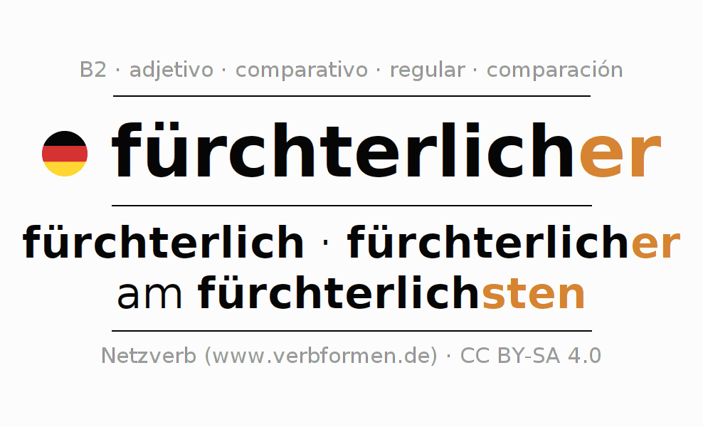 El comparativo en forma de tabla con todas sus formas de declinación: fuerte, débil y mixta. Estas están representadas de forma clara en una tabla sinópica en singular, plural y en los cuatro casos gramaticales: nominativo (primer caso), genitivo (segundo caso), dativo (tercer caso) y acusativo (cuarto caso). Aquí encontraras más información acerca del tema Wiktionary fürchterlicher y aquí también a través del Duden fürchterlicher.