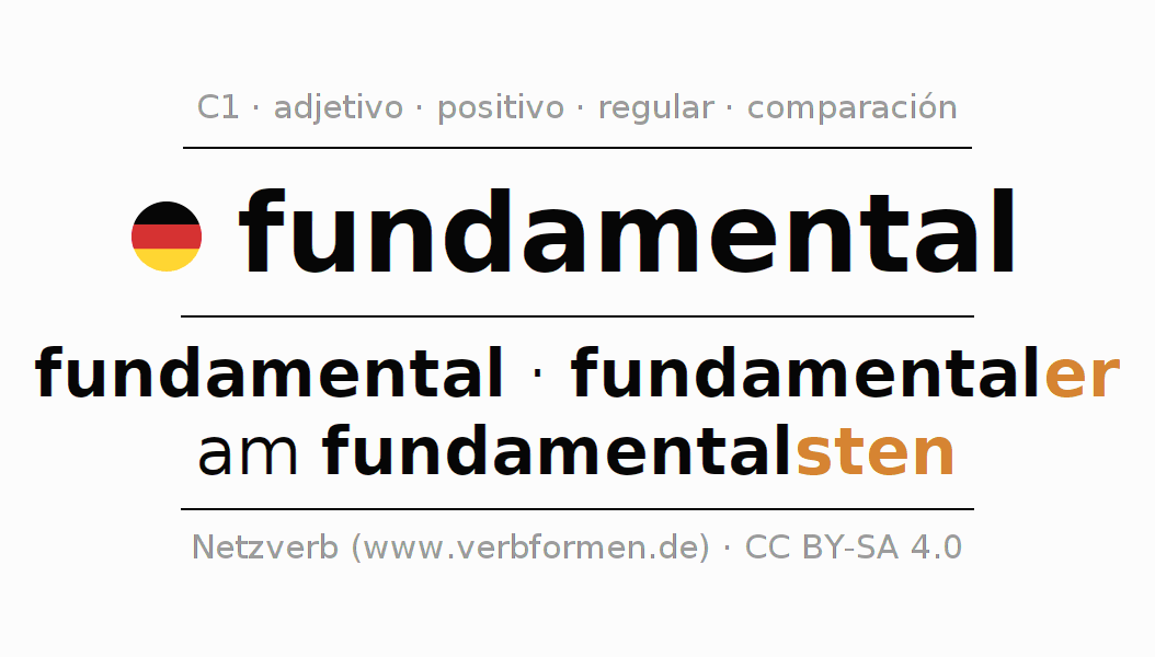 El adjetivo fundamental se declina (fundamental) utilizando las construcciones de comparación. Las terminaciones necesarias para la exaltación, comparación y el superlativo son er/sten. El adjetivo fundamental puede ser utilizado de forma atributiva en frente de un sustantivo así como de forma predicativa en conjunto con un verbo.Aquí puedes declinar y comparar no solamente fundamental sino también todos los adjetivos alemanes. Comentarios ☆