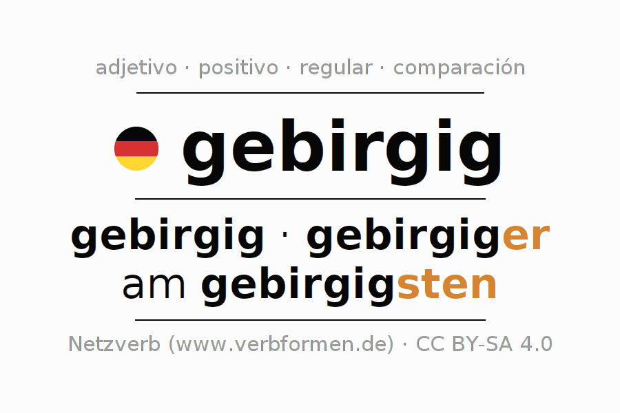 El comparativo en forma de tabla con todas sus formas de declinación: fuerte, débil y mixta. Estas están representadas de forma clara en una tabla sinópica en singular, plural y en los cuatro casos gramaticales: nominativo (primer caso), genitivo (segundo caso), dativo (tercer caso) y acusativo (cuarto caso). Aquí encontraras más información acerca del tema Wiktionary gebirgig y aquí también a través del Duden gebirgig.