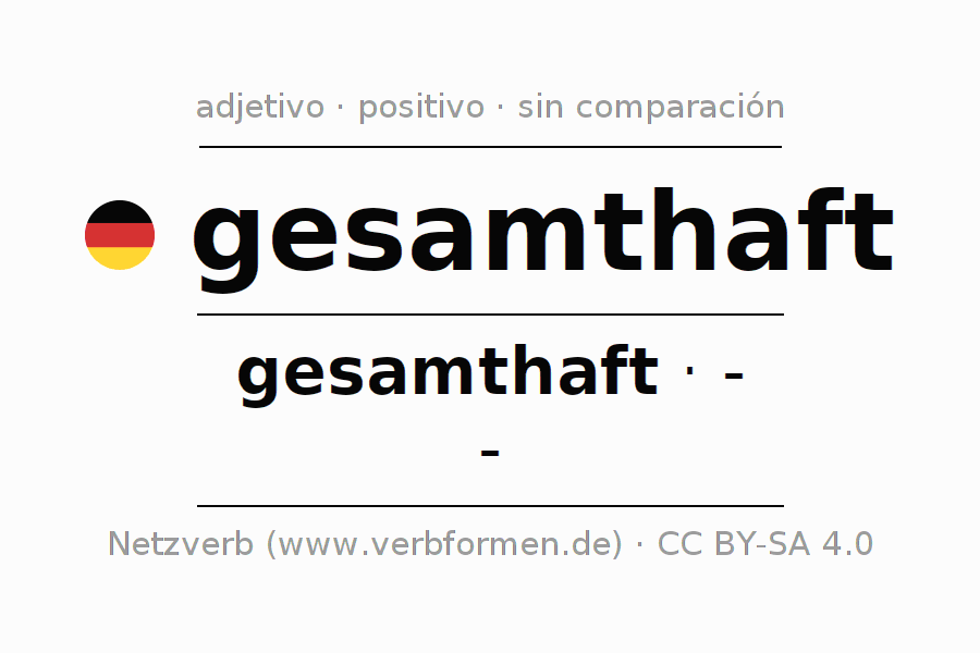 El adjetivo gesamthaft se declina (global, total) utilizando la construcción gesamthaft, la cual no puede ser exaltada, es decir este adjetivo no permite formas del comparativo o superlativo. El adjetivo gesamthaft puede ser utilizado de forma atributiva en frente de un sustantivo así como de forma predicativa en conjunto con un verbo.Aquí puedes declinar y comparar no solamente gesamthaft sino también todos los adjetivos alemanes. Comentarios ☆