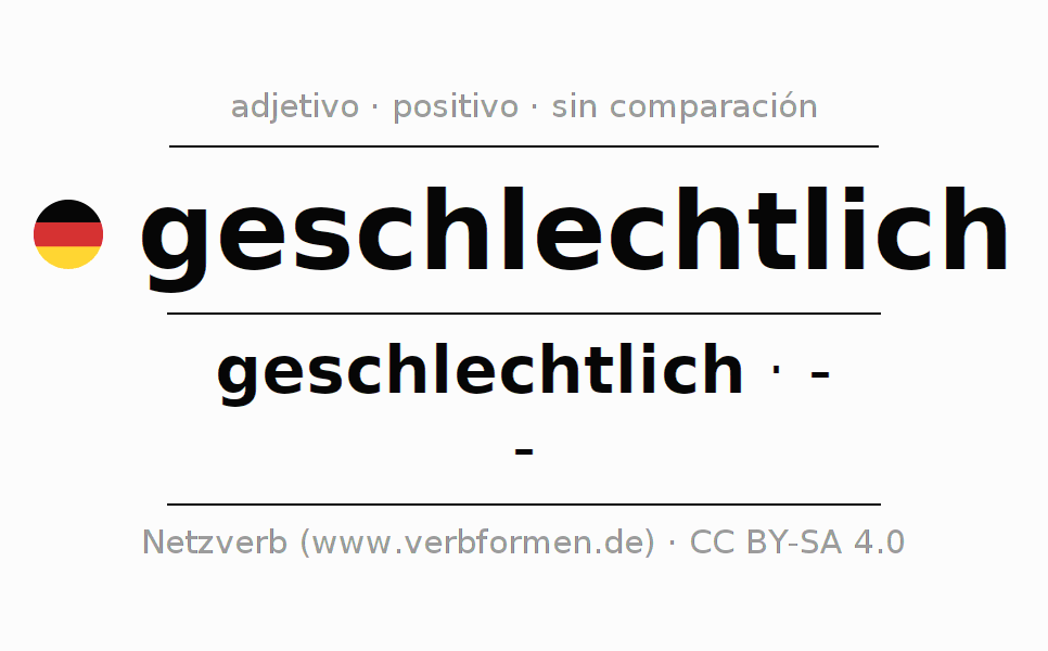 El adjetivo geschlechtlich se declina (sexual, de género) utilizando la construcción geschlechtlich, la cual no puede ser exaltada, es decir este adjetivo no permite formas del comparativo o superlativo. El adjetivo geschlechtlich puede ser utilizado de forma atributiva en frente de un sustantivo así como de forma predicativa en conjunto con un verbo.Aquí puedes declinar y comparar no solamente geschlechtlich sino también todos los adjetivos alemanes. Comentarios ☆