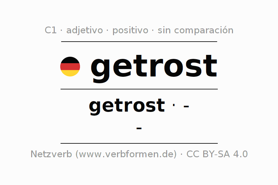 El adjetivo getrost se declina (confiado, seguro) utilizando la construcción getrost, la cual no puede ser exaltada, es decir este adjetivo no permite formas del comparativo o superlativo. El adjetivo getrost puede ser utilizado de forma atributiva en frente de un sustantivo así como de forma predicativa en conjunto con un verbo.Aquí puedes declinar y comparar no solamente getrost sino también todos los adjetivos alemanes. Comentarios ☆