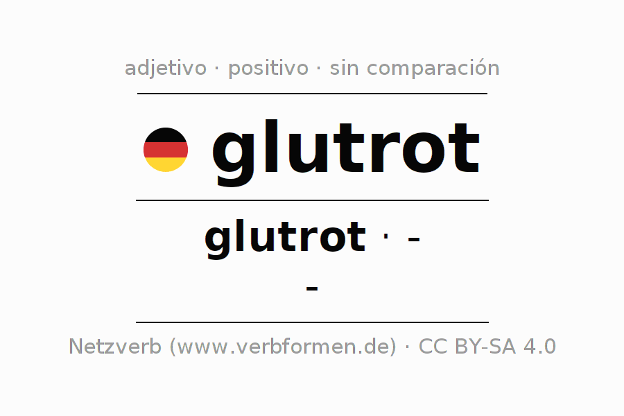 El adjetivo glutrot se declina (rojo intenso, rojo profundo) utilizando la construcción glutrot, la cual no puede ser exaltada, es decir este adjetivo no permite formas del comparativo o superlativo. El adjetivo glutrot puede ser utilizado de forma atributiva en frente de un sustantivo así como de forma predicativa en conjunto con un verbo.Aquí puedes declinar y comparar no solamente glutrot sino también todos los adjetivos alemanes. Comentarios ☆