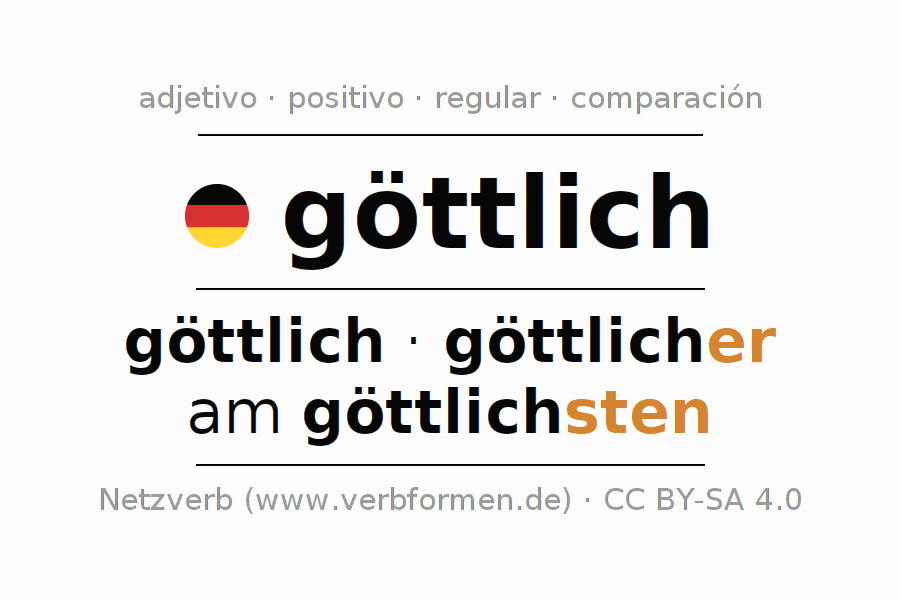 El comparativo en forma de tabla con todas sus formas de declinación: fuerte, débil y mixta. Estas están representadas de forma clara en una tabla sinópica en singular, plural y en los cuatro casos gramaticales: nominativo (primer caso), genitivo (segundo caso), dativo (tercer caso) y acusativo (cuarto caso). Aquí encontraras más información acerca del tema Wiktionary göttlich y aquí también a través del Duden göttlich.