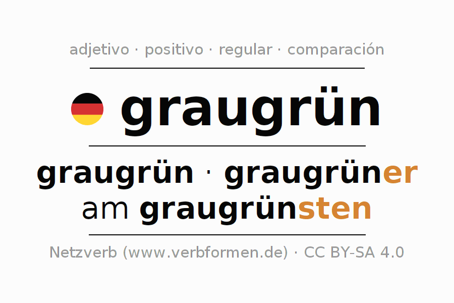 El comparativo en forma de tabla con todas sus formas de declinación: fuerte, débil y mixta. Estas están representadas de forma clara en una tabla sinópica en singular, plural y en los cuatro casos gramaticales: nominativo (primer caso), genitivo (segundo caso), dativo (tercer caso) y acusativo (cuarto caso). Aquí encontraras más información acerca del tema Wiktionary graugrün y aquí también a través del Duden graugrün.