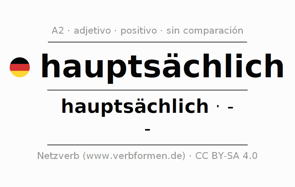 El adjetivo hauptsächlich se declina (principal, principalmente) utilizando la construcción hauptsächlich, la cual no puede ser exaltada, es decir este adjetivo no permite formas del comparativo o superlativo. El adjetivo hauptsächlich puede ser utilizado de forma atributiva en frente de un sustantivo así como de forma predicativa en conjunto con un verbo.Aquí puedes declinar y comparar no solamente hauptsächlich sino también todos los adjetivos alemanes. Comentarios ☆