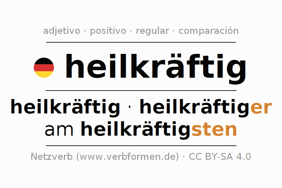 El comparativo en forma de tabla con todas sus formas de declinación: fuerte, débil y mixta. Estas están representadas de forma clara en una tabla sinópica en singular, plural y en los cuatro casos gramaticales: nominativo (primer caso), genitivo (segundo caso), dativo (tercer caso) y acusativo (cuarto caso). Aquí encontraras más información acerca del tema Wiktionary heilkräftig y aquí también a través del Duden heilkräftig.