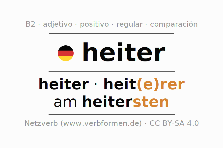 El adjetivo heiter se declina (alegre, sereno) utilizando las construcciones de comparación. Las terminaciones necesarias para la exaltación, comparación y el superlativo son er/sten. El adjetivo heiter puede ser utilizado de forma atributiva en frente de un sustantivo así como de forma predicativa en conjunto con un verbo.Aquí puedes declinar y comparar no solamente heiter sino también todos los adjetivos alemanes. Comentarios ☆