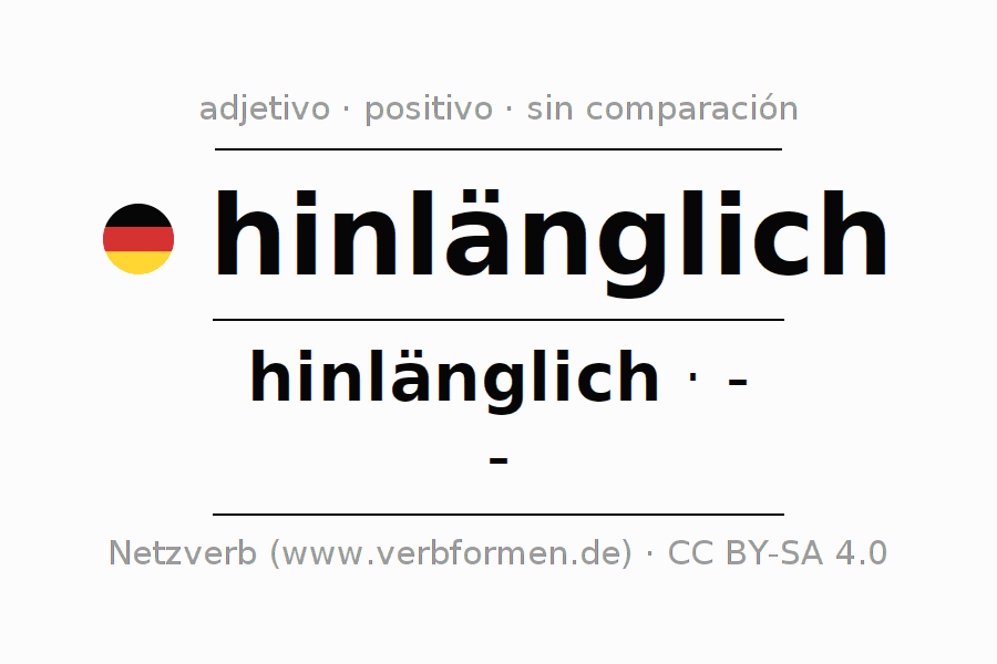 El adjetivo hinlänglich se declina (suficiente, adecuado) utilizando la construcción hinlänglich, la cual no puede ser exaltada, es decir este adjetivo no permite formas del comparativo o superlativo. El adjetivo hinlänglich puede ser utilizado de forma atributiva en frente de un sustantivo así como de forma predicativa en conjunto con un verbo.Aquí puedes declinar y comparar no solamente hinlänglich sino también todos los adjetivos alemanes. Comentarios ☆