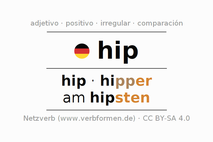 El adjetivo hip se declina (a la moda, moderno) utilizando las construcciones de comparación. Las terminaciones necesarias para la exaltación, comparación y el superlativo son er/sten. El adjetivo hip puede ser utilizado de forma atributiva en frente de un sustantivo así como de forma predicativa en conjunto con un verbo.Aquí puedes declinar y comparar no solamente hip sino también todos los adjetivos alemanes. Comentarios ☆