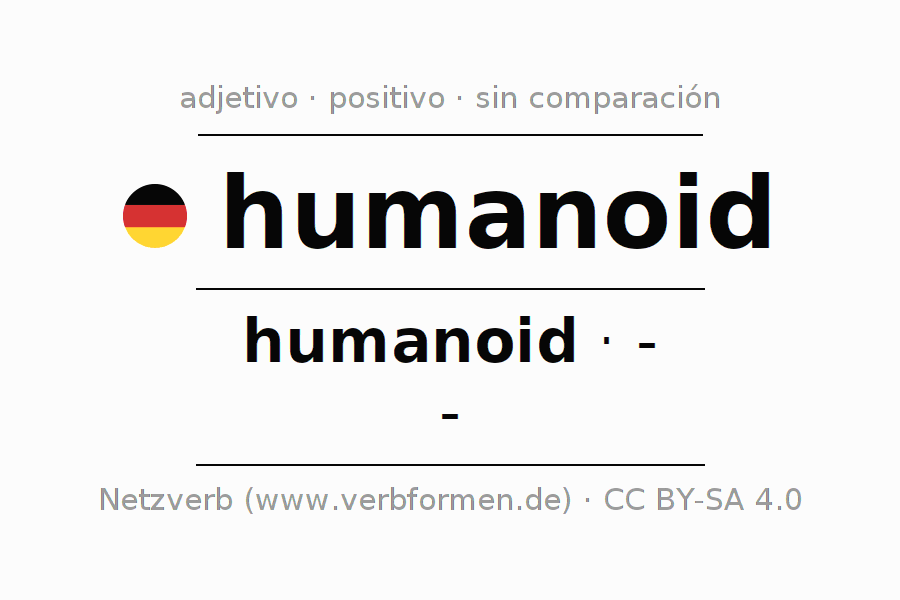 El adjetivo humanoid se declina (humanoide) utilizando la construcción humanoid, la cual no puede ser exaltada, es decir este adjetivo no permite formas del comparativo o superlativo. El adjetivo humanoid puede ser utilizado de forma atributiva en frente de un sustantivo así como de forma predicativa en conjunto con un verbo.Aquí puedes declinar y comparar no solamente humanoid sino también todos los adjetivos alemanes. Comentarios ☆