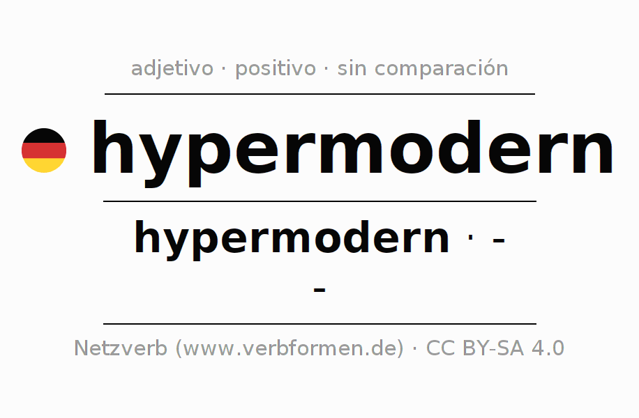 El adjetivo hypermodern se declina (hipermoderno) utilizando la construcción hypermodern, la cual no puede ser exaltada, es decir este adjetivo no permite formas del comparativo o superlativo. El adjetivo hypermodern puede ser utilizado de forma atributiva en frente de un sustantivo así como de forma predicativa en conjunto con un verbo.Aquí puedes declinar y comparar no solamente hypermodern sino también todos los adjetivos alemanes. Comentarios ☆