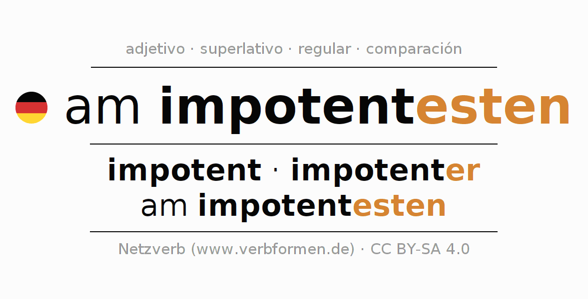 El comparativo en forma de tabla con todas sus formas de declinación: fuerte, débil y mixta. Estas están representadas de forma clara en una tabla sinópica en singular, plural y en los cuatro casos gramaticales: nominativo (primer caso), genitivo (segundo caso), dativo (tercer caso) y acusativo (cuarto caso). Aquí encontraras más información acerca del tema Wiktionary am impotentesten y aquí también a través del Duden am impotentesten.