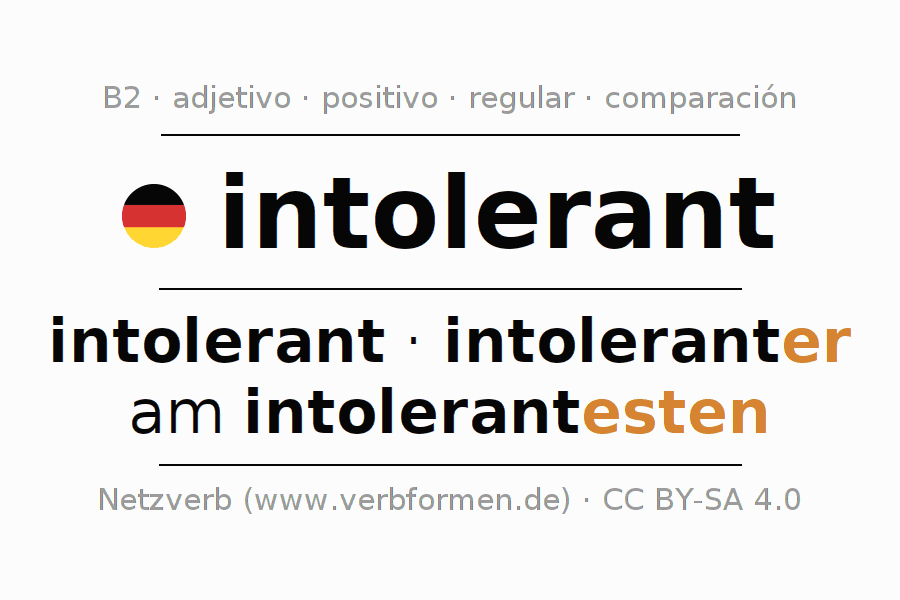 El adjetivo intolerant se declina (intolerante) utilizando las construcciones de comparación. Las terminaciones necesarias para la exaltación, comparación y el superlativo son er/esten. El adjetivo intolerant puede ser utilizado de forma atributiva en frente de un sustantivo así como de forma predicativa en conjunto con un verbo.Aquí puedes declinar y comparar no solamente intolerant sino también todos los adjetivos alemanes. Comentarios ☆