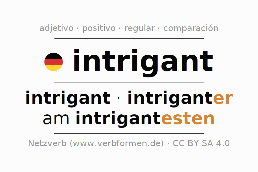 El comparativo en forma de tabla con todas sus formas de declinación: fuerte, débil y mixta. Estas están representadas de forma clara en una tabla sinópica en singular, plural y en los cuatro casos gramaticales: nominativo (primer caso), genitivo (segundo caso), dativo (tercer caso) y acusativo (cuarto caso). Aquí encontraras más información acerca del tema Wiktionary intrigant y aquí también a través del Duden intrigant.