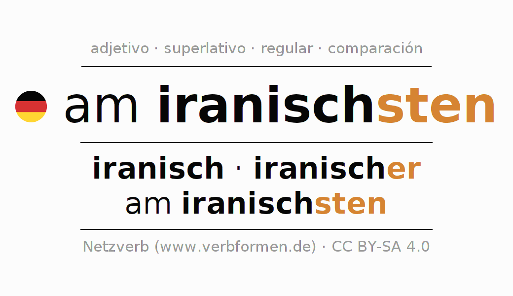El comparativo en forma de tabla con todas sus formas de declinación: fuerte, débil y mixta. Estas están representadas de forma clara en una tabla sinópica en singular, plural y en los cuatro casos gramaticales: nominativo (primer caso), genitivo (segundo caso), dativo (tercer caso) y acusativo (cuarto caso). Aquí encontraras más información acerca del tema Wiktionary am iranischsten y aquí también a través del Duden am iranischsten.
