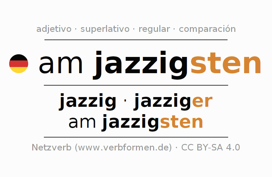 El comparativo en forma de tabla con todas sus formas de declinación: fuerte, débil y mixta. Estas están representadas de forma clara en una tabla sinópica en singular, plural y en los cuatro casos gramaticales: nominativo (primer caso), genitivo (segundo caso), dativo (tercer caso) y acusativo (cuarto caso). Aquí encontraras más información acerca del tema Wiktionary am jazzigsten y aquí también a través del Duden am jazzigsten.