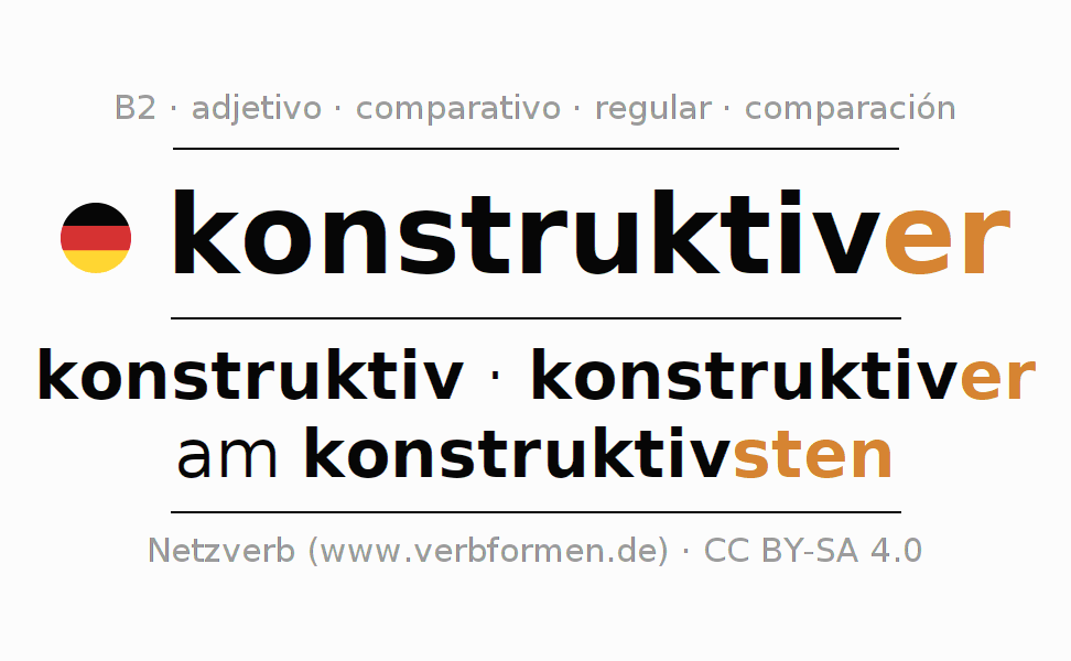 El adjetivo konstruktiver se declina (constructivo) utilizando las construcciones de comparación. Las terminaciones necesarias para la exaltación, comparación y el superlativo son er/sten. El adjetivo konstruktiver puede ser utilizado de forma atributiva en frente de un sustantivo así como de forma predicativa en conjunto con un verbo.Aquí puedes declinar y comparar no solamente konstruktiver sino también todos los adjetivos alemanes. Comentarios ☆