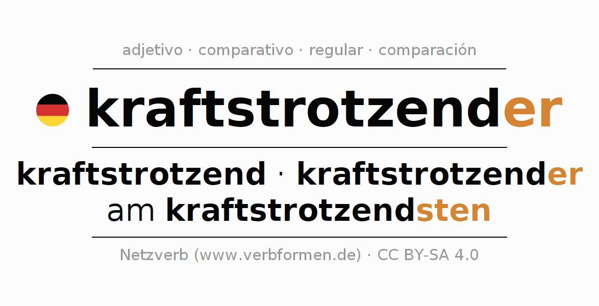 El comparativo en forma de tabla con todas sus formas de declinación: fuerte, débil y mixta. Estas están representadas de forma clara en una tabla sinópica en singular, plural y en los cuatro casos gramaticales: nominativo (primer caso), genitivo (segundo caso), dativo (tercer caso) y acusativo (cuarto caso). Aquí encontraras más información acerca del tema Wiktionary kraftstrotzender y aquí también a través del Duden kraftstrotzender.