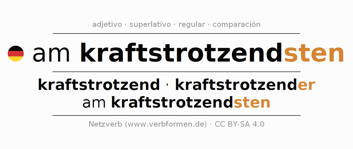 El comparativo en forma de tabla con todas sus formas de declinación: fuerte, débil y mixta. Estas están representadas de forma clara en una tabla sinópica en singular, plural y en los cuatro casos gramaticales: nominativo (primer caso), genitivo (segundo caso), dativo (tercer caso) y acusativo (cuarto caso). Aquí encontraras más información acerca del tema Wiktionary am kraftstrotzendsten y aquí también a través del Duden am kraftstrotzendsten.