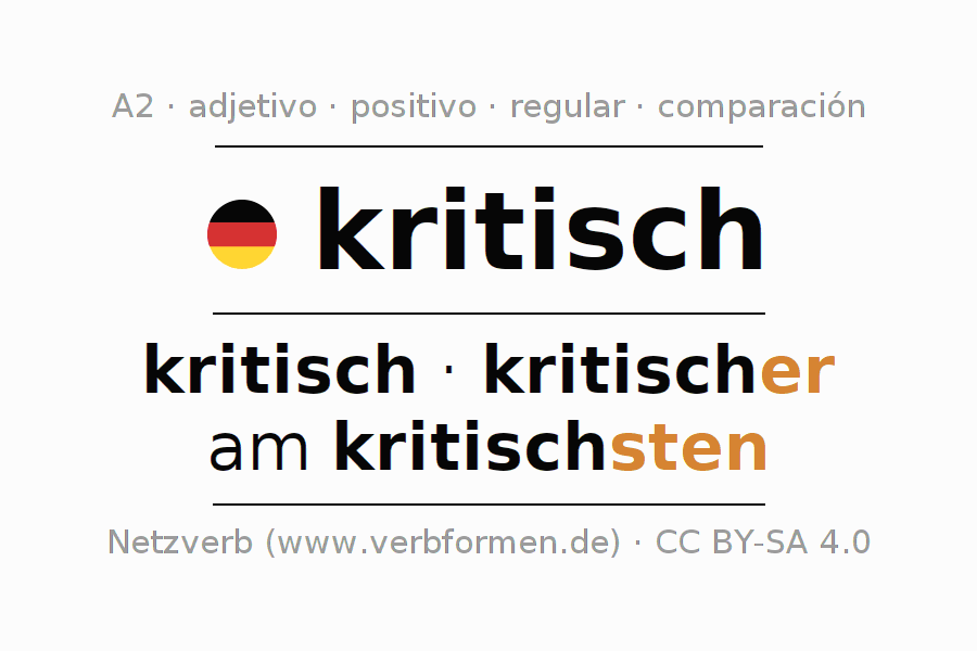 El adjetivo kritisch se declina (crítico, cuestionador) utilizando las construcciones de comparación. Las terminaciones necesarias para la exaltación, comparación y el superlativo son er/sten. El adjetivo kritisch puede ser utilizado de forma atributiva en frente de un sustantivo así como de forma predicativa en conjunto con un verbo.Aquí puedes declinar y comparar no solamente kritisch sino también todos los adjetivos alemanes. Comentarios ☆