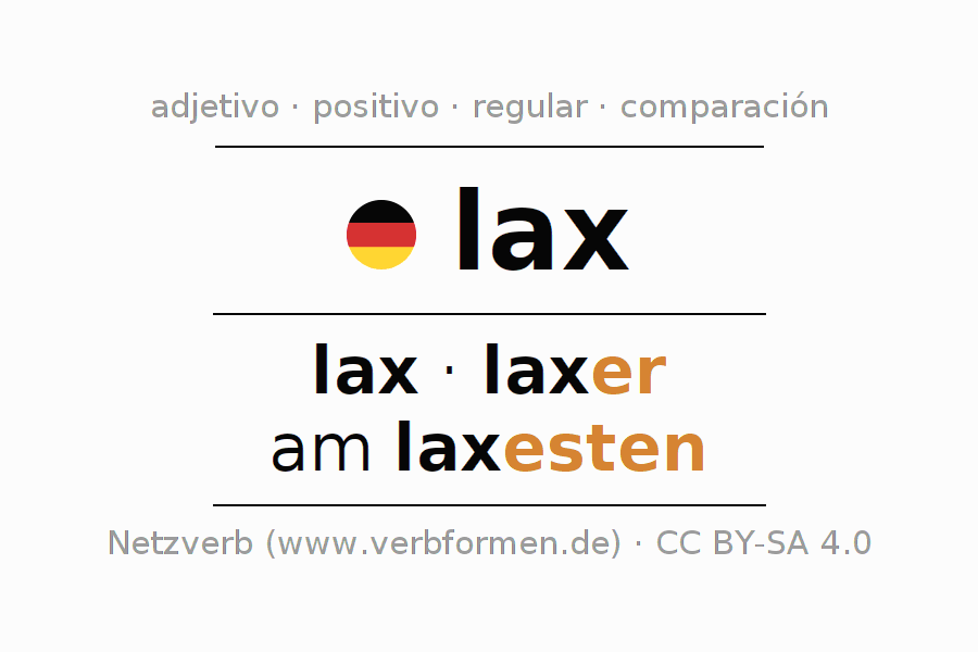 El adjetivo lax se declina (laxo, suave) utilizando las construcciones de comparación. Las terminaciones necesarias para la exaltación, comparación y el superlativo son er/esten. El adjetivo lax puede ser utilizado de forma atributiva en frente de un sustantivo así como de forma predicativa en conjunto con un verbo.Aquí puedes declinar y comparar no solamente lax sino también todos los adjetivos alemanes. Comentarios ☆