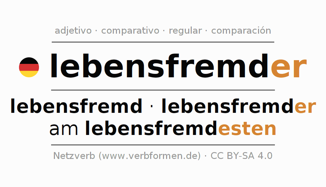 El comparativo en forma de tabla con todas sus formas de declinación: fuerte, débil y mixta. Estas están representadas de forma clara en una tabla sinópica en singular, plural y en los cuatro casos gramaticales: nominativo (primer caso), genitivo (segundo caso), dativo (tercer caso) y acusativo (cuarto caso). Aquí encontraras más información acerca del tema Wiktionary lebensfremder y aquí también a través del Duden lebensfremder.