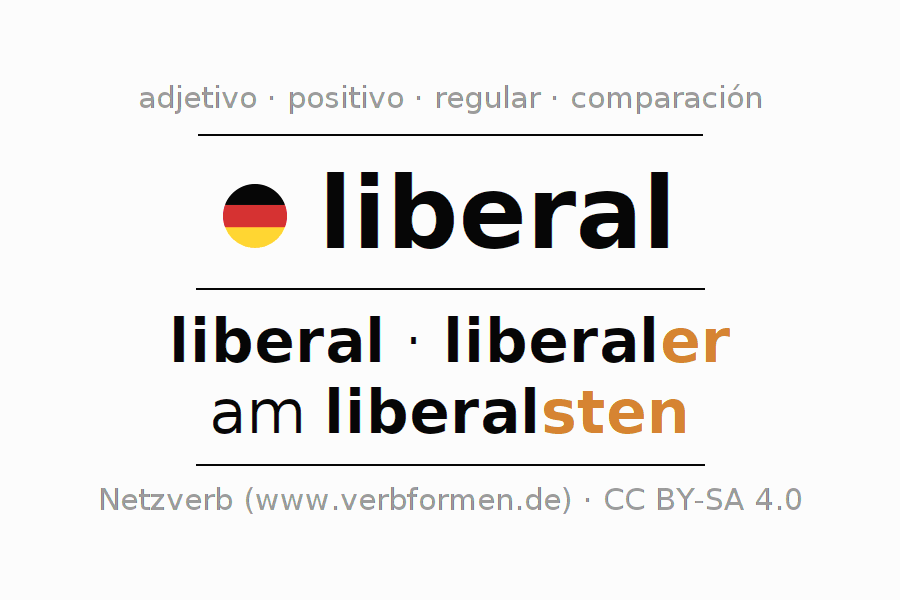 El adjetivo liberal se declina (liberal, libertario) utilizando las construcciones de comparación. Las terminaciones necesarias para la exaltación, comparación y el superlativo son er/sten. El adjetivo liberal puede ser utilizado de forma atributiva en frente de un sustantivo así como de forma predicativa en conjunto con un verbo.Aquí puedes declinar y comparar no solamente liberal sino también todos los adjetivos alemanes. Comentarios ☆