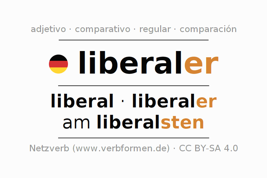 El adjetivo liberaler se declina (liberal, libertario) utilizando las construcciones de comparación. Las terminaciones necesarias para la exaltación, comparación y el superlativo son er/sten. El adjetivo liberaler puede ser utilizado de forma atributiva en frente de un sustantivo así como de forma predicativa en conjunto con un verbo.Aquí puedes declinar y comparar no solamente liberaler sino también todos los adjetivos alemanes. Comentarios ☆