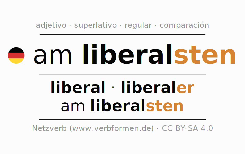 El adjetivo am liberalsten se declina (liberal, libertario) utilizando las construcciones de comparación. Las terminaciones necesarias para la exaltación, comparación y el superlativo son er/sten. El adjetivo am liberalsten puede ser utilizado de forma atributiva en frente de un sustantivo así como de forma predicativa en conjunto con un verbo.Aquí puedes declinar y comparar no solamente am liberalsten sino también todos los adjetivos alemanes. Comentarios ☆