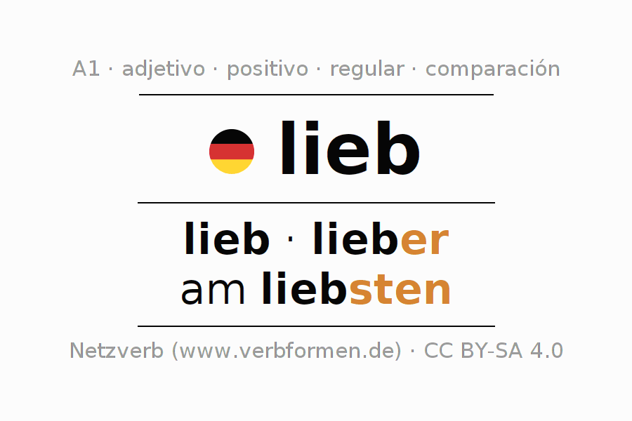 El comparativo en forma de tabla con todas sus formas de declinación: fuerte, débil y mixta. Estas están representadas de forma clara en una tabla sinópica en singular, plural y en los cuatro casos gramaticales: nominativo (primer caso), genitivo (segundo caso), dativo (tercer caso) y acusativo (cuarto caso). Aquí encontraras más información acerca del tema Wiktionary lieb y aquí también a través del Duden lieb.