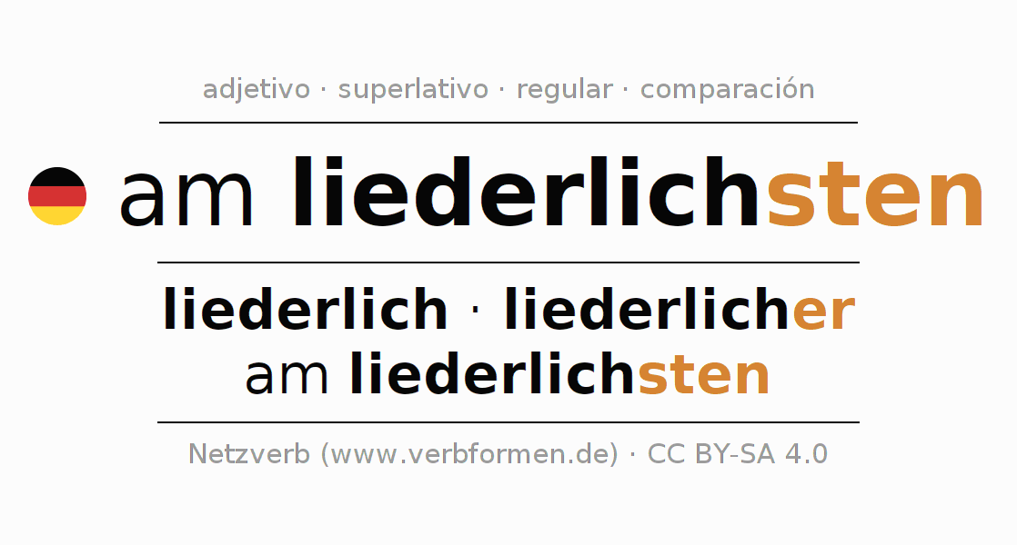 El comparativo en forma de tabla con todas sus formas de declinación: fuerte, débil y mixta. Estas están representadas de forma clara en una tabla sinópica en singular, plural y en los cuatro casos gramaticales: nominativo (primer caso), genitivo (segundo caso), dativo (tercer caso) y acusativo (cuarto caso). Aquí encontraras más información acerca del tema Wiktionary am liederlichsten y aquí también a través del Duden am liederlichsten.