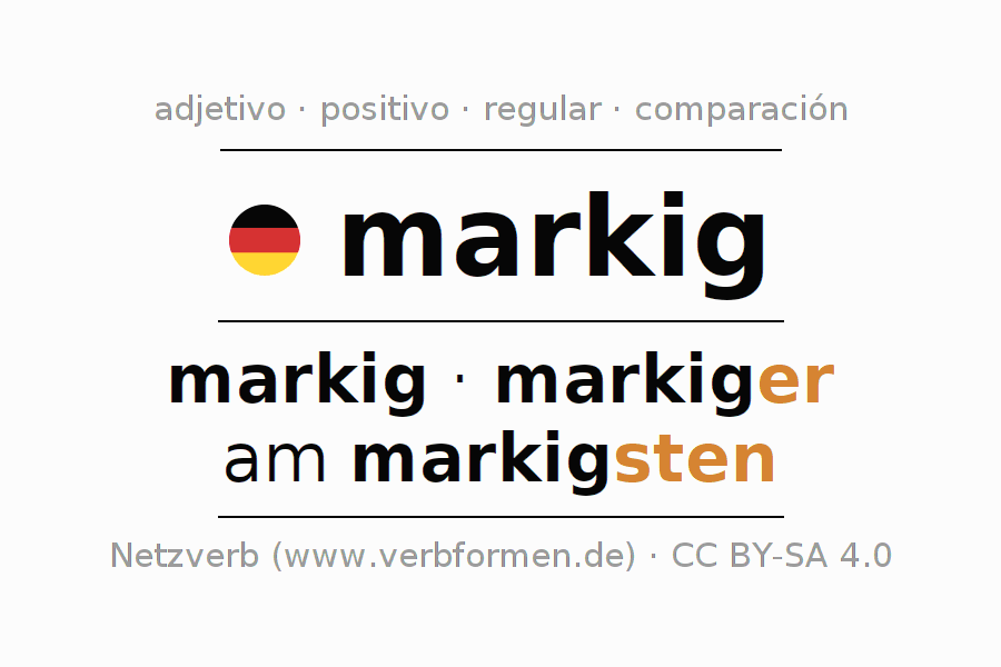 El comparativo en forma de tabla con todas sus formas de declinación: fuerte, débil y mixta. Estas están representadas de forma clara en una tabla sinópica en singular, plural y en los cuatro casos gramaticales: nominativo (primer caso), genitivo (segundo caso), dativo (tercer caso) y acusativo (cuarto caso). Aquí encontraras más información acerca del tema Wiktionary markig y aquí también a través del Duden markig.