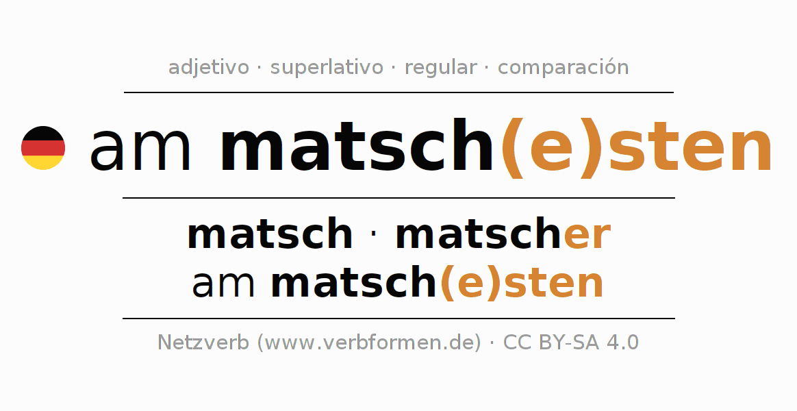 El comparativo en forma de tabla con todas sus formas de declinación: fuerte, débil y mixta. Estas están representadas de forma clara en una tabla sinópica en singular, plural y en los cuatro casos gramaticales: nominativo (primer caso), genitivo (segundo caso), dativo (tercer caso) y acusativo (cuarto caso). Aquí encontraras más información acerca del tema Wiktionary am matschesten y aquí también a través del Duden am matschesten.