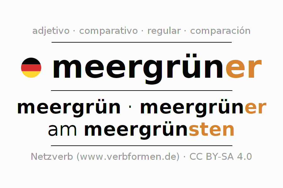 El comparativo en forma de tabla con todas sus formas de declinación: fuerte, débil y mixta. Estas están representadas de forma clara en una tabla sinópica en singular, plural y en los cuatro casos gramaticales: nominativo (primer caso), genitivo (segundo caso), dativo (tercer caso) y acusativo (cuarto caso). Aquí encontraras más información acerca del tema Wiktionary meergrüner y aquí también a través del Duden meergrüner.
