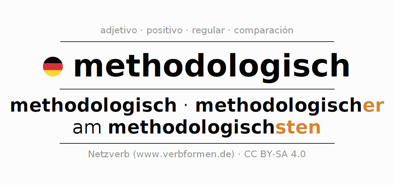 El adjetivo methodologisch se declina (metodológico) utilizando las construcciones de comparación. Las terminaciones necesarias para la exaltación, comparación y el superlativo son er/sten. El adjetivo methodologisch puede ser utilizado de forma atributiva en frente de un sustantivo así como de forma predicativa en conjunto con un verbo.Aquí puedes declinar y comparar no solamente methodologisch sino también todos los adjetivos alemanes. Comentarios ☆
