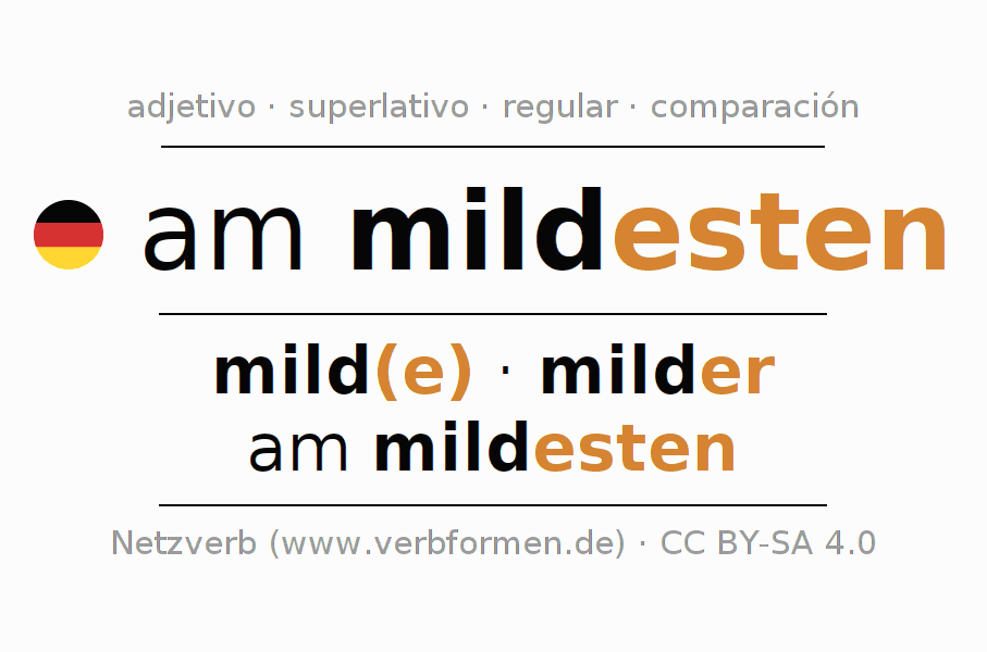 El comparativo en forma de tabla con todas sus formas de declinación: fuerte, débil y mixta. Estas están representadas de forma clara en una tabla sinópica en singular, plural y en los cuatro casos gramaticales: nominativo (primer caso), genitivo (segundo caso), dativo (tercer caso) y acusativo (cuarto caso). Aquí encontraras más información acerca del tema Wiktionary am mildesten y aquí también a través del Duden am mildesten.