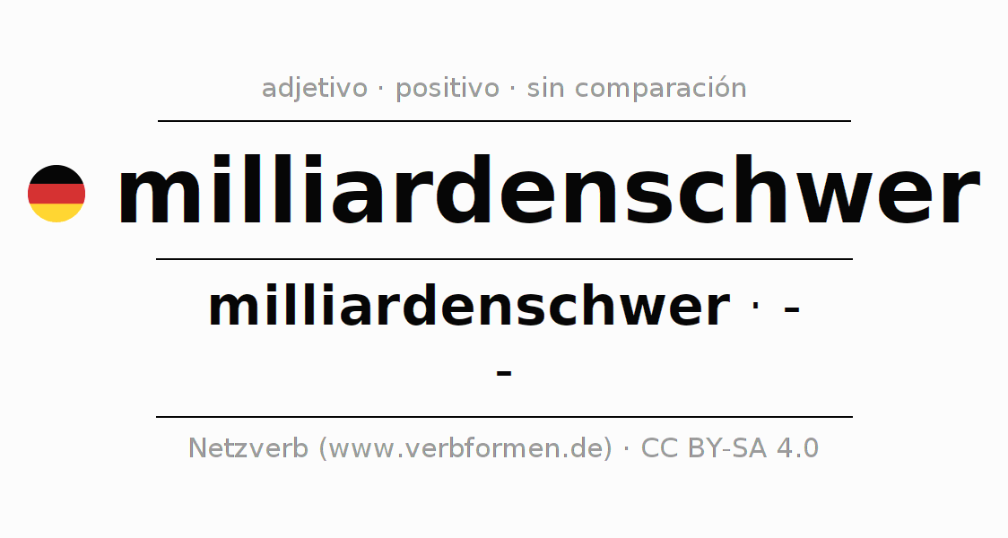 El comparativo en forma de tabla con todas sus formas de declinación: fuerte, débil y mixta. Estas están representadas de forma clara en una tabla sinópica en singular, plural y en los cuatro casos gramaticales: nominativo (primer caso), genitivo (segundo caso), dativo (tercer caso) y acusativo (cuarto caso). Aquí encontraras más información acerca del tema Wiktionary milliardenschwer y aquí también a través del Duden milliardenschwer.