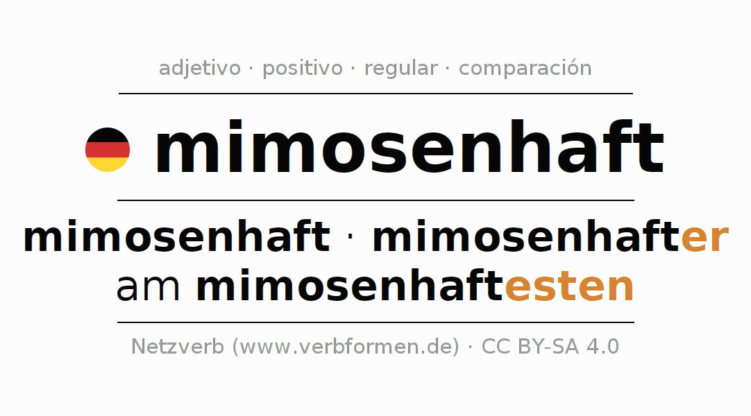 El comparativo en forma de tabla con todas sus formas de declinación: fuerte, débil y mixta. Estas están representadas de forma clara en una tabla sinópica en singular, plural y en los cuatro casos gramaticales: nominativo (primer caso), genitivo (segundo caso), dativo (tercer caso) y acusativo (cuarto caso). Aquí encontraras más información acerca del tema Wiktionary mimosenhaft y aquí también a través del Duden mimosenhaft.